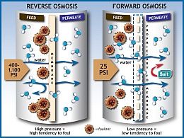 In this example, the process of Reverse Osmosis (RO) is compared with forward Osmosis (FO). RO typically requires high pumping pressures, which require high energy usage to force the feed solution against a very tight membrane material and force the filtered water through the membrane to the clean water side. During that process all solutes and pollutants on the dirty water side are forced against the membrane material, under high pressure, which compunds RO's sensitivity to fouling and need for relatively clean feed streams. Conversely, FO operates at very low pressure, simply adequate to circulate the fluids, and the natural osmotic pressure in the draw solution pulls water through the membrane, leaving solids and foulants behind in the concentrated feed solution.
